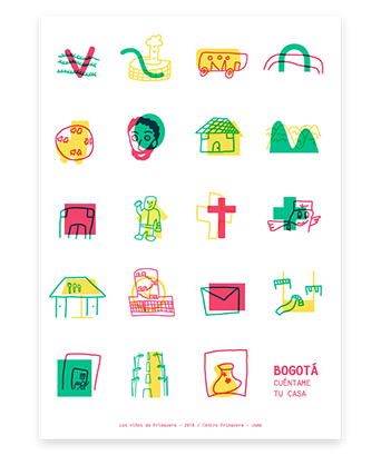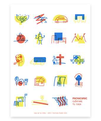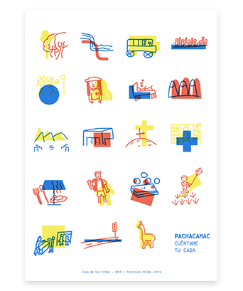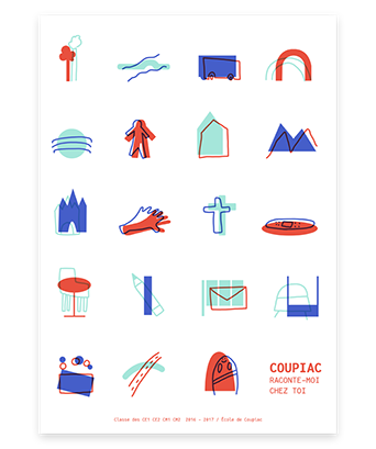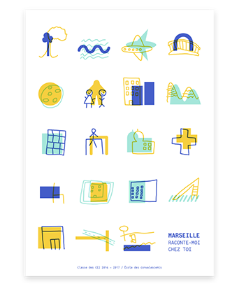 Depuis 2017 | Raconte-moi chez toi est un projet d'atelier de création graphique développé dans le cadre de l'appel à projet Création en cours porté par les Ateliers Médicis. Afin d'interroger ce qui façonne leur milieu culturel et leur patrimoine local, les enfants et les adolescents·es participants·es sont invités·es à réaliser de manière collective un alphabet conçu à partir d'une base de 19 signes correspondant à une série 19 mots désignant des éléments et des espaces urbains-ruraux. L'atelier, d'abord conçu avec les enfants et l'enseignante Diane Larrouy de l'école des Vallons à Coupiac en Aveyron, s'est exporté à l'école des Convalescents de Belsunce à Marseille, puis à l'institut Mundo Libre de Pachacamac au Perou, et au Centro Primavera de Bogotá en Colombie. Publications : Avec le soutient et l'aide de : El Centro Primavera | L'École des Vallons de Coupiac | L'École des Convelescents de Belsunce | Diane Larrouy | Yella Bystron | Élodie Hardouin, Charlotte Lucas et Mathieu Guibert www.racontemoicheztoi.com Les Ateliers Médicis Plateforme Sociale Design Création en Cours El Instituto Mundo Libre