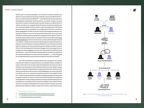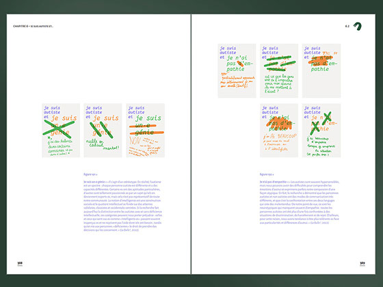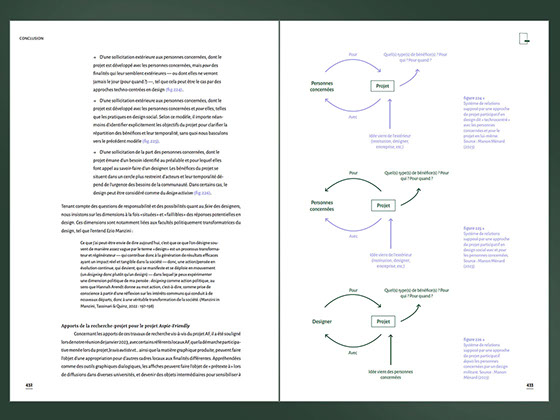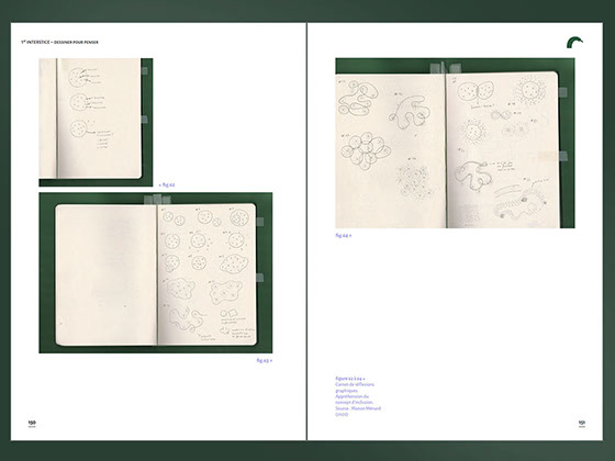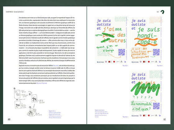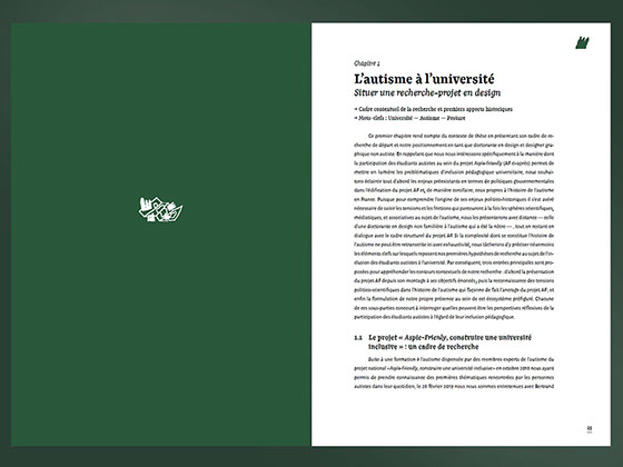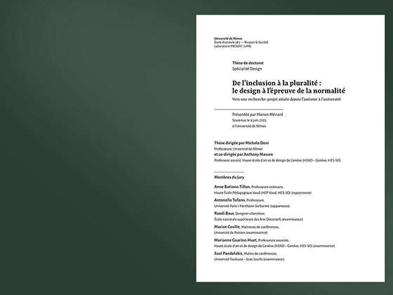 Avril 2023 | Soutenue en juin 2023, ma thèse de doctorat en design s'intitule « De l'inclusion à la pluralité : le design à l'épreuve de la normalité. Vers une recherche-projet depuis l'autisme à l'université ». J'ai mené ce travail de recherche sous la direction de Michela Deni (Université de Nîmes) et de Anthony Masure (HEAD — Genève), au sein du laboratoire PROJEKT (UPR) de l'université de Nîmes, financée par l'ANR dans le cadre du projet NCU « Aspie-Friendly, construire une université inclusive ». J'ai réalisé la mise en page du manuscrit de thèse de 478 pages. J'ai veillé à ce que la mise en page et le contenu iconographique puissent mettre en avant les méthodologies en recherche-création et recherche-projet déployées pour mon travail, notamment à travers la pratique de dessin. J'ai alors intégré au sein du manuscrit de thèse des « interstices graphiques », un format éditorial exploratoire mettant en exergue certaines réflexions constitutives de l'argumentaire scientifique. Édition Atelier-Exposition Illustration Enseignement