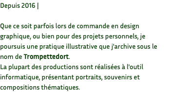 Depuis 2016 | Que ce soit parfois lors de commande en design graphique, ou bien pour des projets personnels, je poursuis une pratique illustrative que j'archive sous le nom de Trompettedort. La plupart des productions sont réalisées à l'outil informatique, présentant portraits, souvenirs et compositions thématiques. Édition Atelier-Exposition Illustration Enseignement