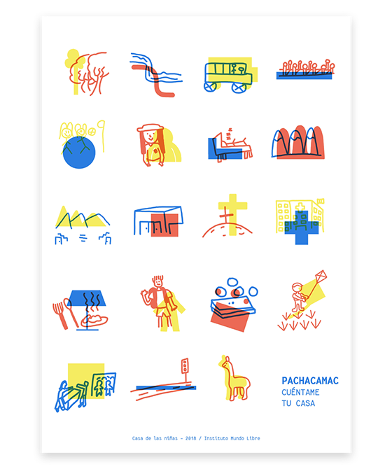 Depuis 2017 | Raconte-moi chez toi est un projet d'atelier de création graphique développé dans le cadre de l'appel à projet Création en cours porté par les Ateliers Médicis. Afin d'interroger ce qui façonne leur milieu culturel et leur patrimoine local, les enfants et les adolescents·es participants·es sont invités·es à réaliser de manière collective un alphabet conçu à partir d'une base de 19 signes correspondant à une série 19 mots désignant des éléments et des espaces urbains-ruraux. L'atelier, d'abord conçu avec les enfants et l'enseignante Diane Larrouy de l'école des Vallons à Coupiac en Aveyron, s'est exporté à l'école des Convalescents de Belsunce à Marseille, puis à l'institut Mundo Libre de Pachacamac au Perou, et au Centro Primavera de Bogotá en Colombie. Publications : Avec le soutient et l'aide de : El Centro Primavera L'École des Vallons de Coupiac L'École des Convalescents de Belsunce Diane Larrouy Yella Bystron Élodie Hardouin, Charlotte Lucas et Mathieu Guibert projet suivant → Édition Atelier-Exposition Illustration Enseignement