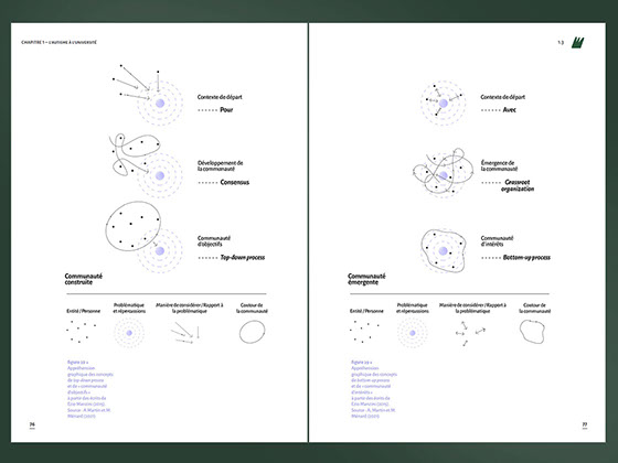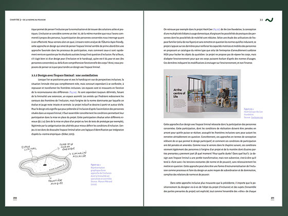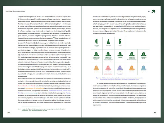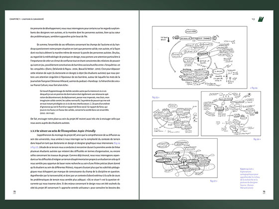 Avril 2023 | Soutenue en juin 2023, ma thèse de doctorat en design s'intitule « De l'inclusion à la pluralité : le design à l'épreuve de la normalité. Vers une recherche-projet depuis l'autisme à l'université ». J'ai mené ce travail de recherche sous la direction de Michela Deni (Université de Nîmes) et de Anthony Masure (HEAD — Genève), au sein du laboratoire PROJEKT (UPR) de l'université de Nîmes, financée par l'ANR dans le cadre du projet NCU « Aspie-Friendly, construire une université inclusive ». J'ai réalisé la mise en page du manuscrit de thèse de 478 pages. J'ai veillé à ce que la mise en page et le contenu iconographique puissent mettre en avant les méthodologies en recherche-création et recherche-projet déployées pour mon travail, notamment à travers la pratique de dessin. J'ai alors intégré au sein du manuscrit de thèse des « interstices graphiques », un format éditorial exploratoire mettant en exergue certaines réflexions constitutives de l'argumentaire scientifique. Édition Atelier-Exposition Illustration Enseignement